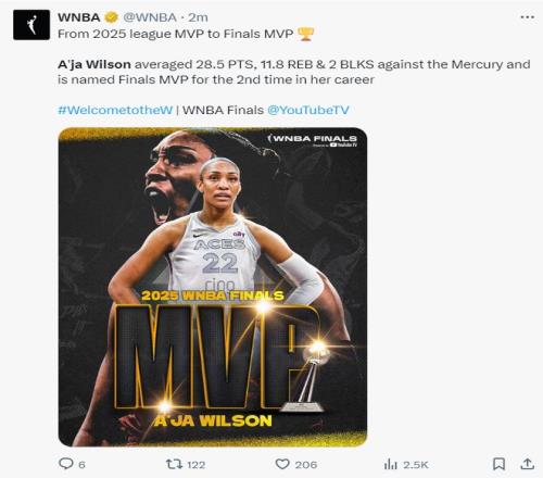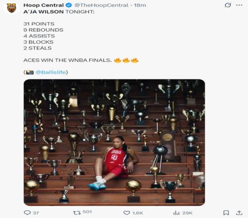 美媒NBACentral写道:王牌拿到了WNBA总冠军,威尔逊成为FMVP,我们正在见证GOAT。